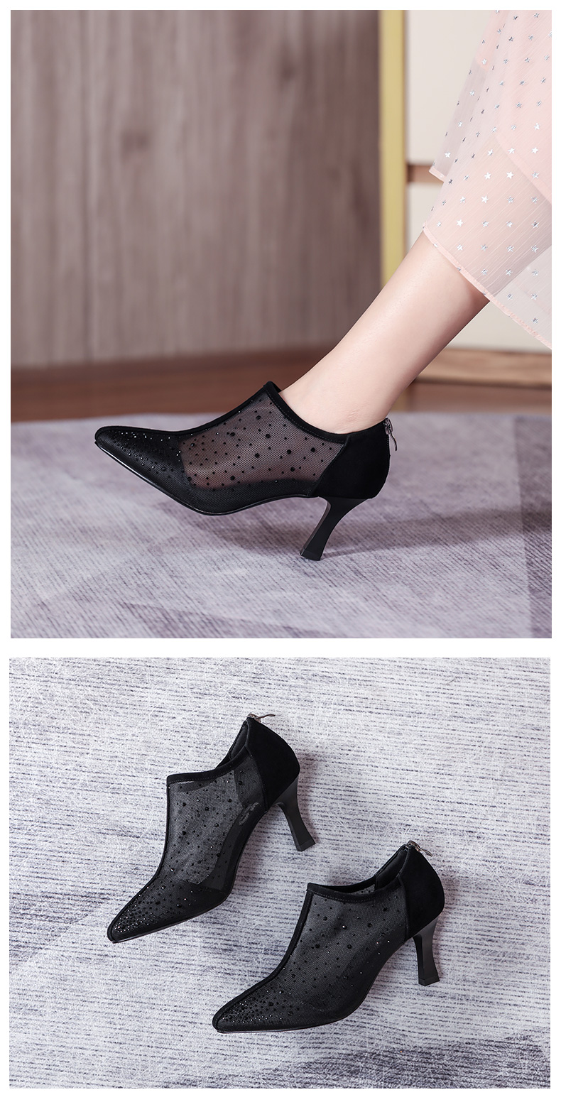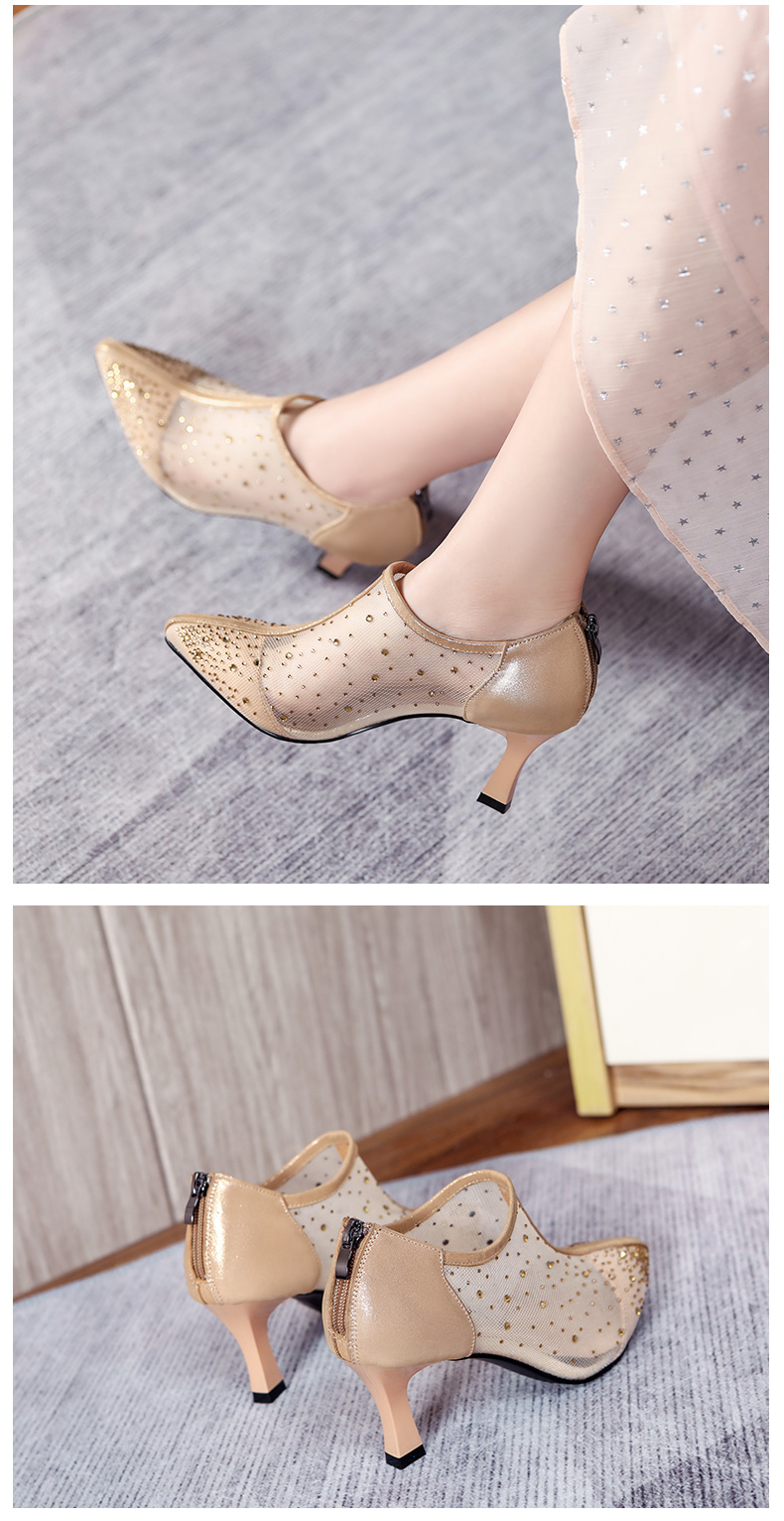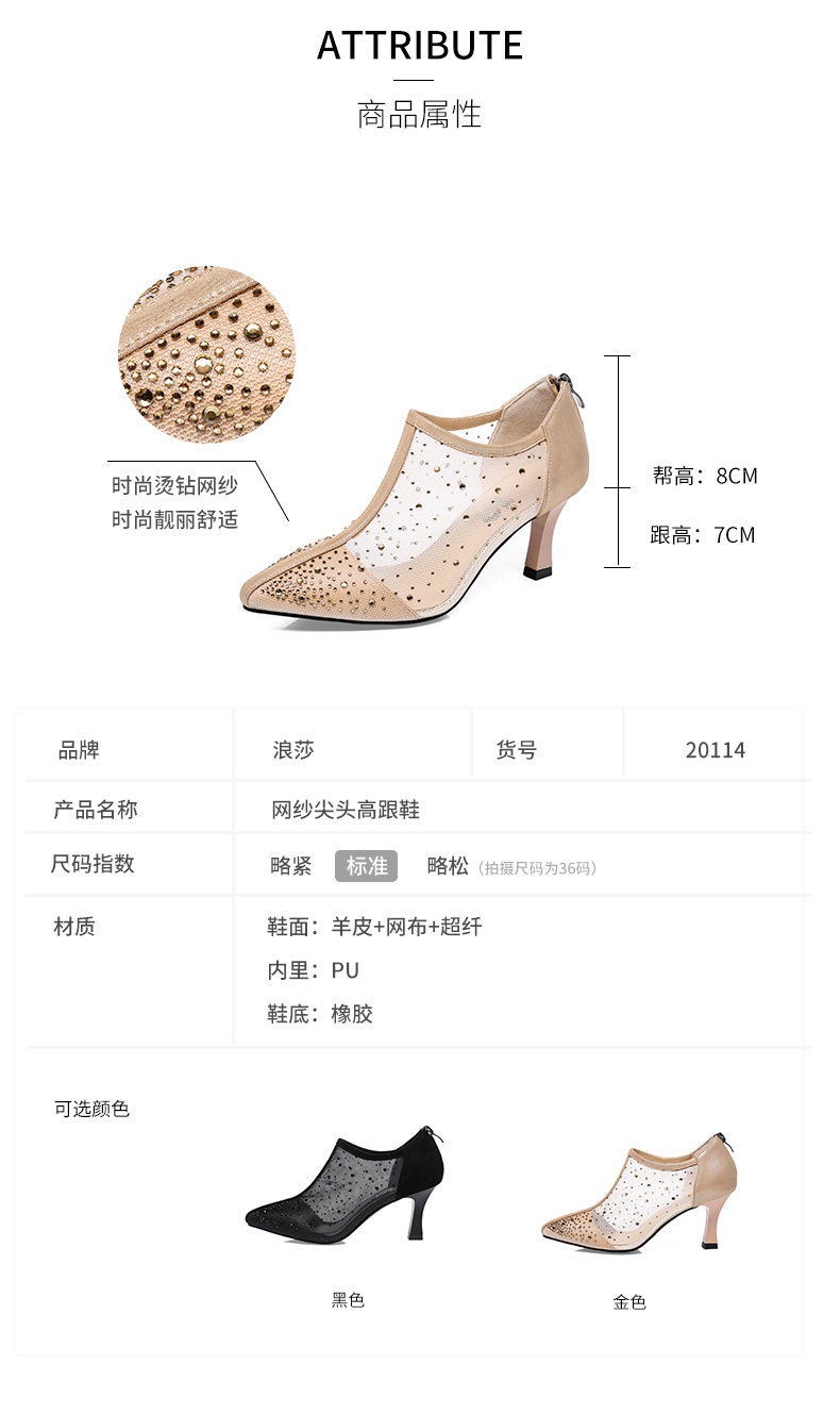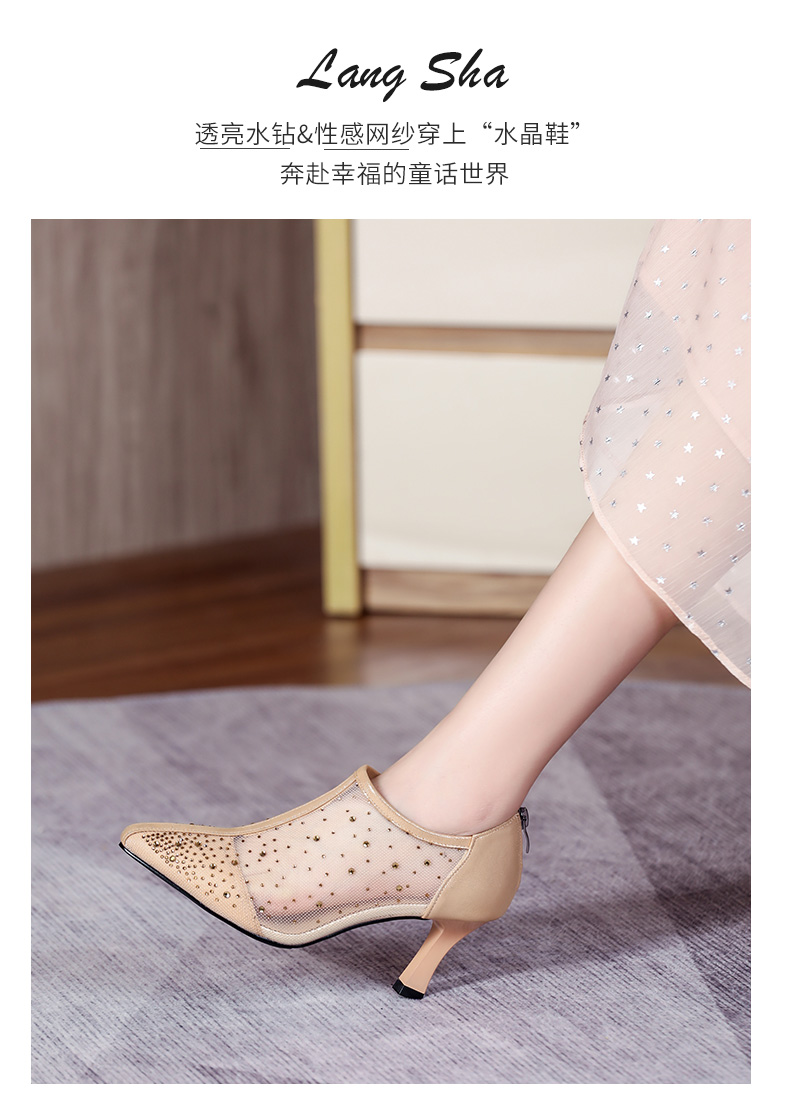 浪莎法式尖頭高跟鞋女細跟2021春夏新款深口鏤空網紗水鉆休閑單鞋
