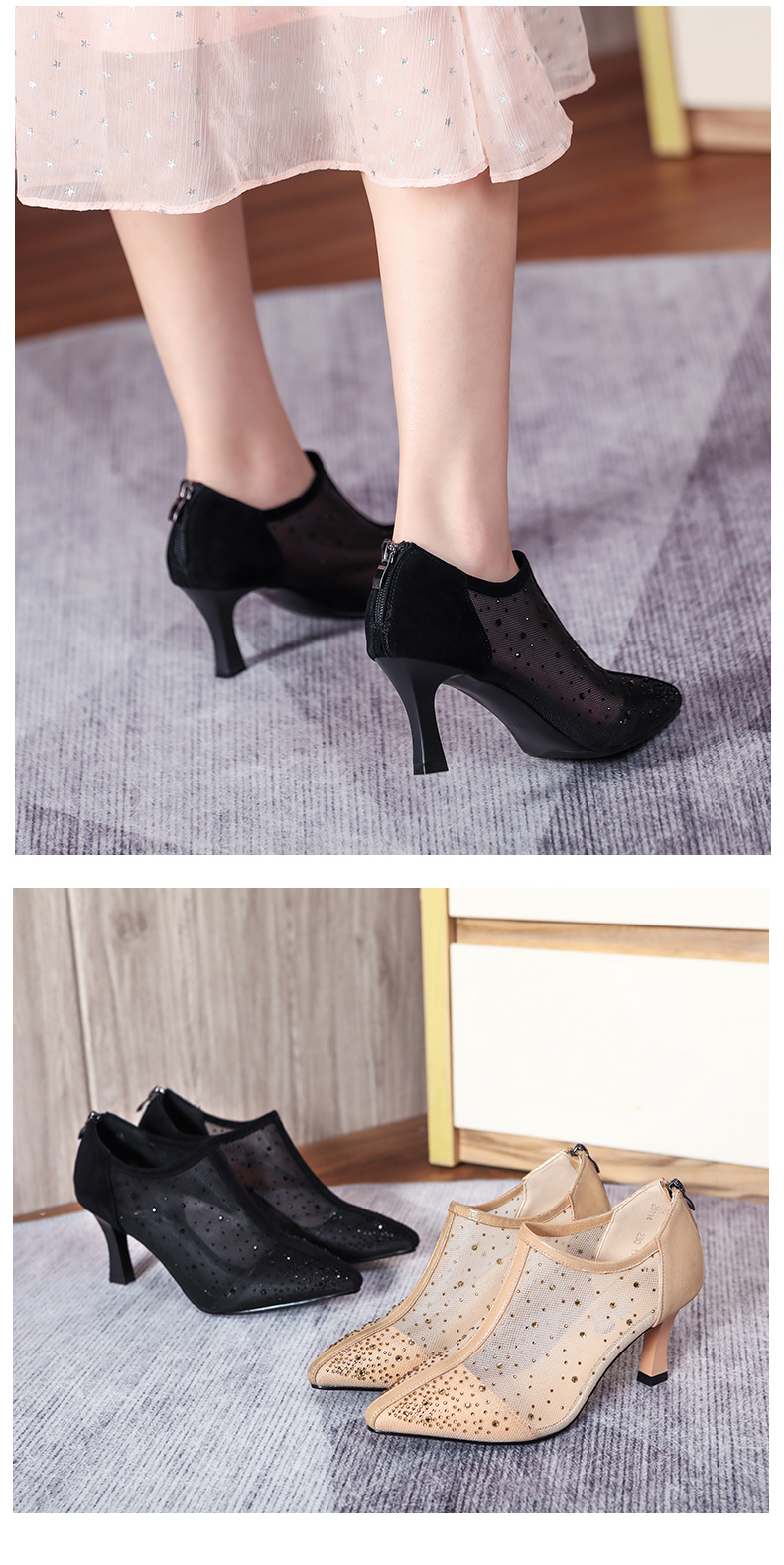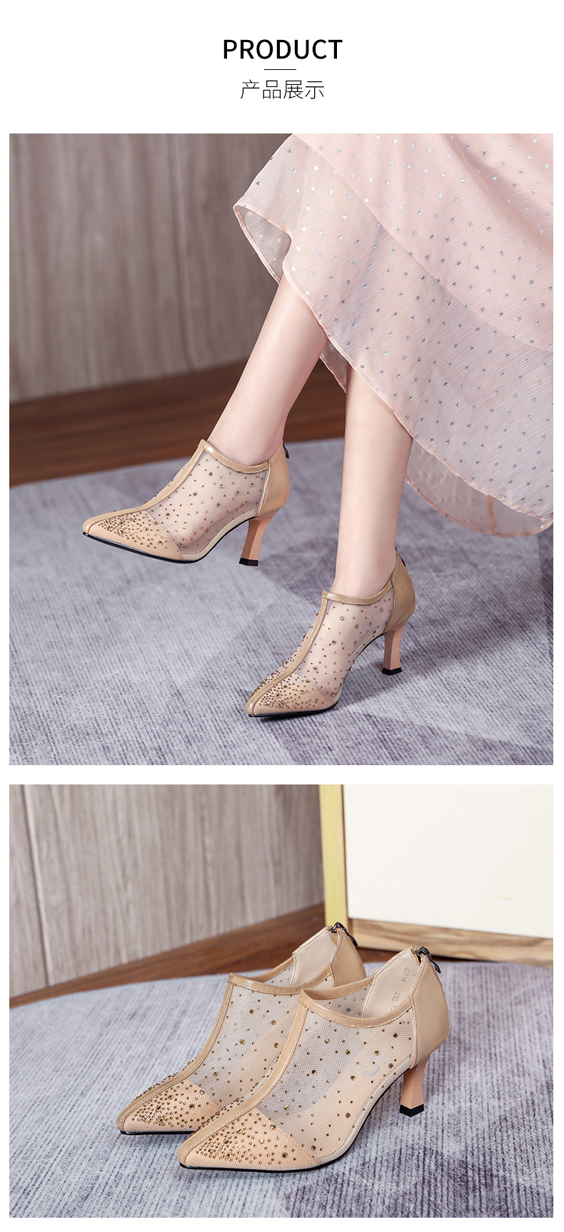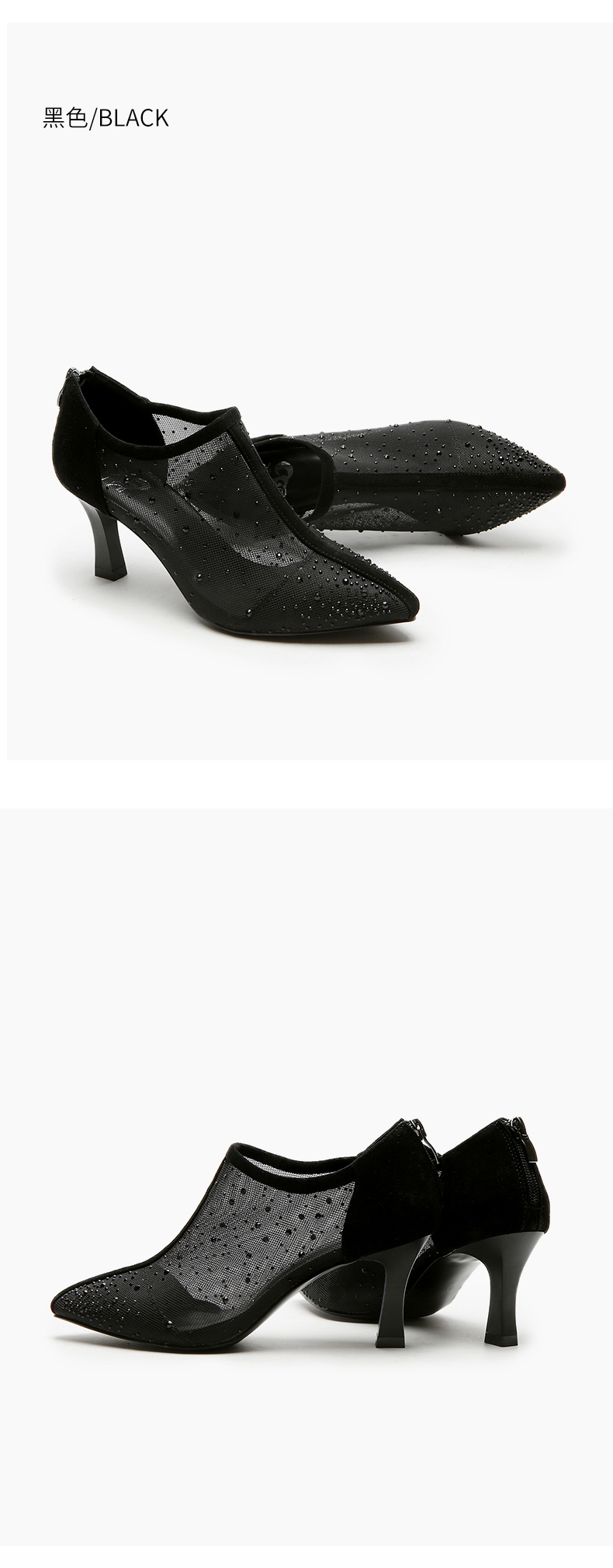 浪莎法式尖頭高跟鞋女細跟2021春夏新款深口鏤空網紗水鉆休閑單鞋