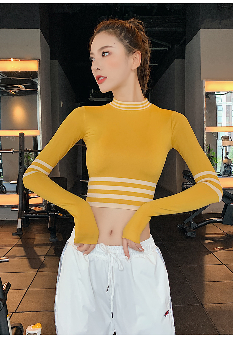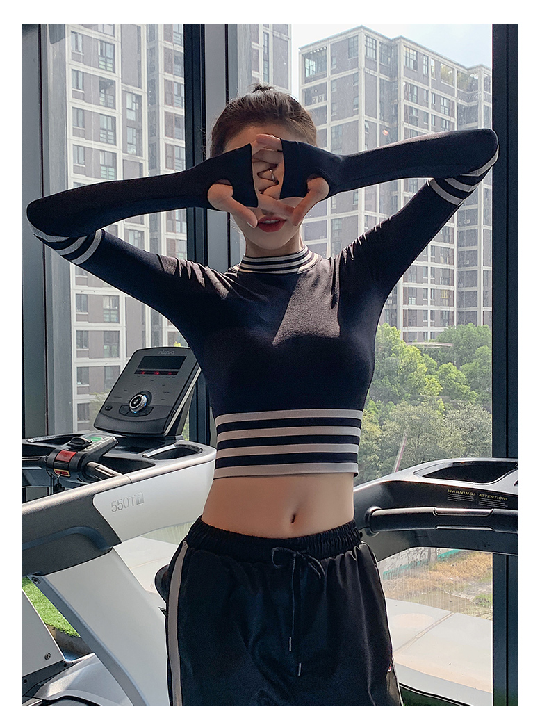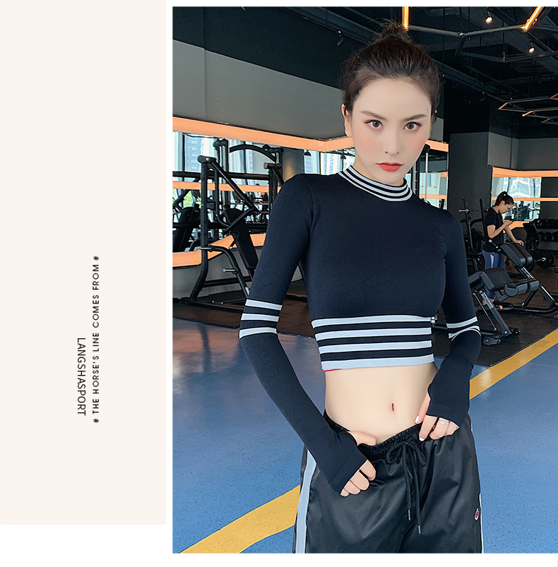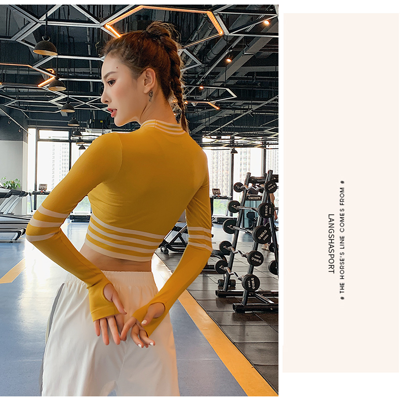 浪莎長袖健身衣女露臍性感運動T恤速干緊身春秋跑步瑜伽服上衣